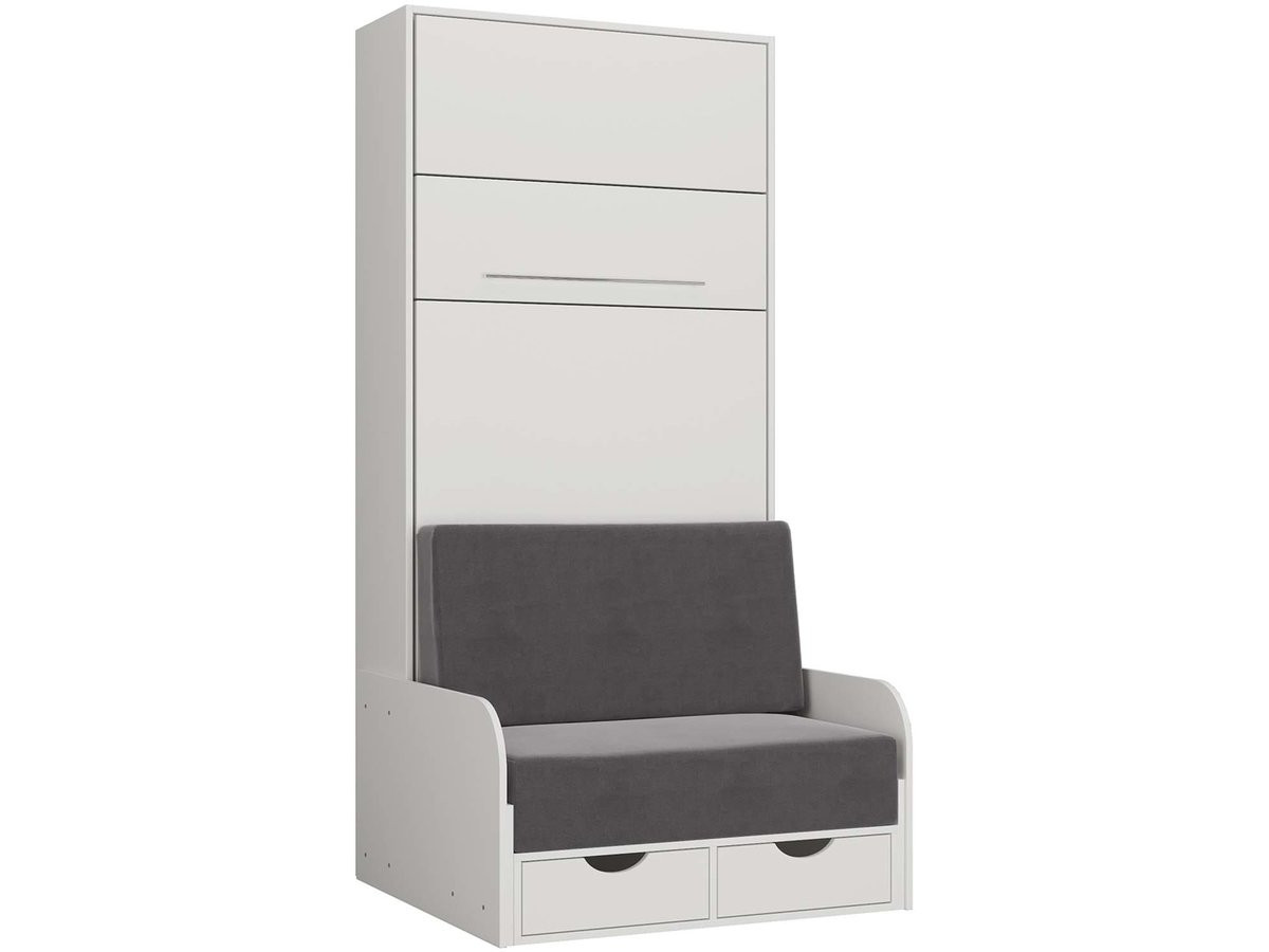 Lit escamotable « KYM SOFA 5 » – 90 x 200 cm – Banquette avec tissu gris -ouverture assistée – 2 tiroirs – Blanc