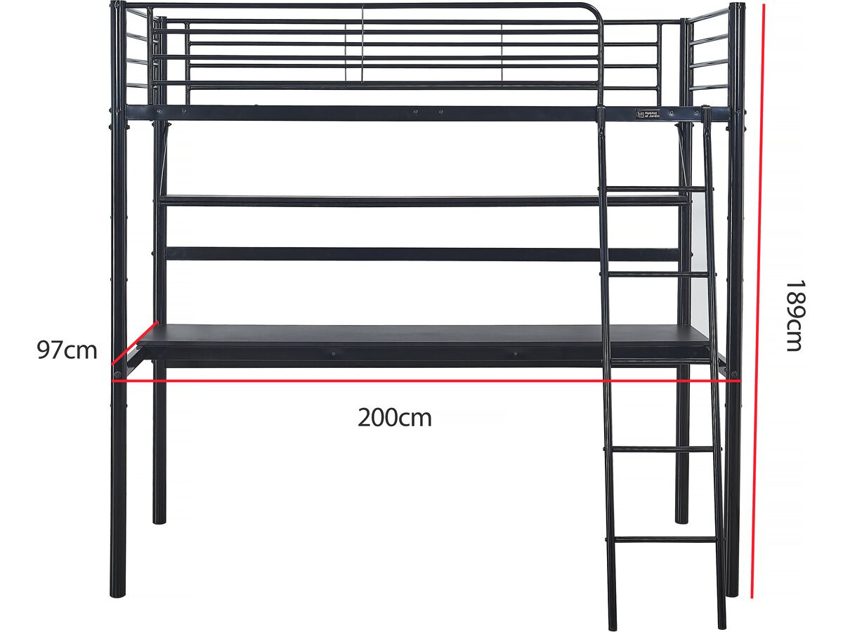 Lit mezzanine « Alona » – 90 x 190 cm – Noir – Dimensions : 200 x 97 x 189 cm – Matière : Tube en acier avec un revêtement en poudre – Hauteur de couchage : 152 cm