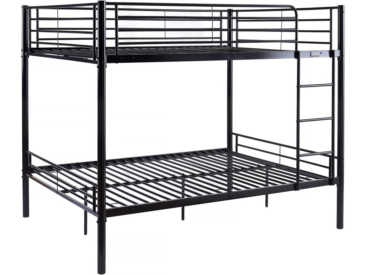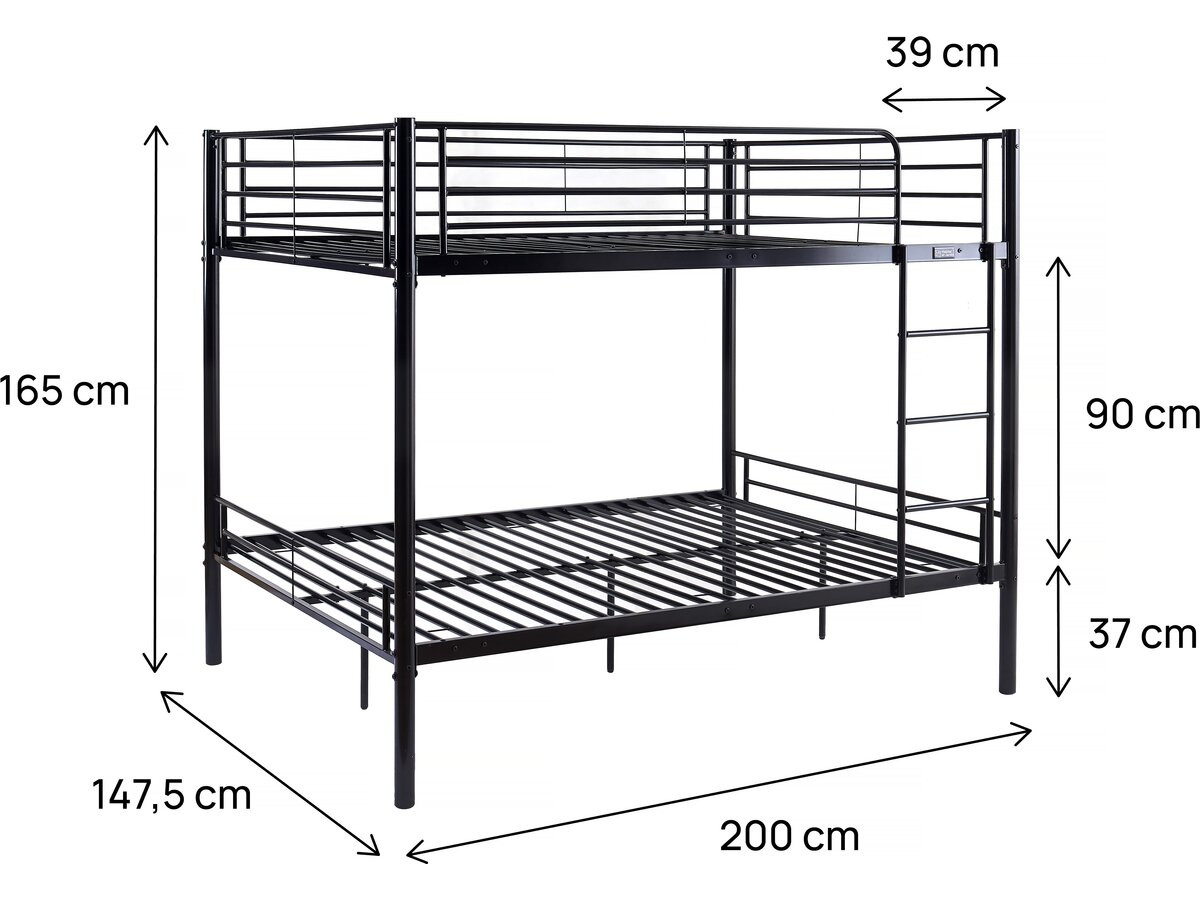 Lit double superposé mezzanine en métal « Adam » – Dimensions : 200 x 147,5 x 165 cm – Dimensions du matelas : 140 x 190 cm (matelas non inclus) – Distance entre les deux lits : 90 cm – Noir