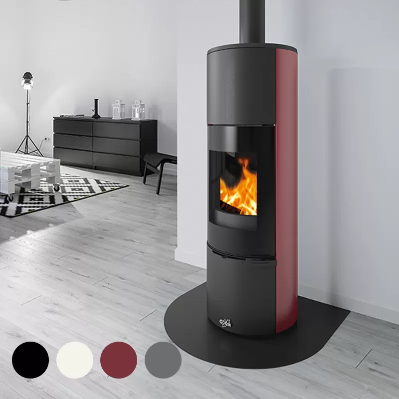 Avec ses 50 cm de diamètre, le poêle à bois THENON s’installe facilement partout. Il est proposé en quatre coloris. Son foyer étanche et sa puissance de 7.5 kW le destine plutôt aux habitations récentes (BBC, RT2012, RE2020). Il peut accueillir un accumulateur de chaleur en option. Ce kit est constitué de briques réfractaires capables d’emmagasiner la chaleur. La montée en température est plus lente, mais le poêle chauffe plus longtemps. Cela permet également d’optimiser la récupération d’énergie en captant une partie de la chaleur normalement évacuée par le conduit de cheminée.