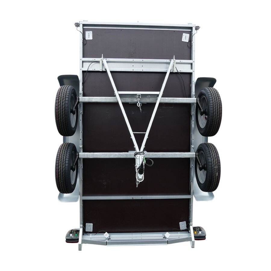 La flèche en « V » renforce la rigidité du châssis et optimise la tenue de route par rapport à un timon droit. Les roues de 13 pouces contribuent également à une meilleure stabilité. Des pieds de stockage permettent un rangement vertical pour optimiser l’espace dans votre garage.